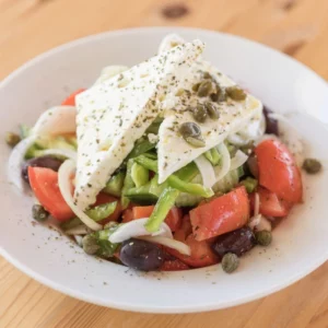 avec notre fromage mykonien maison, fenouil de mer, feuilles de câpres et sauce au vinaigre balsamique