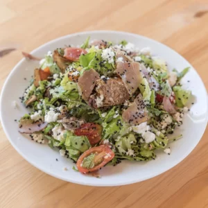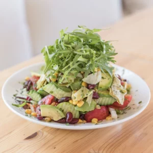 bouquet de salades vertes, poulet fumé apaki, porc fumé apaki, fromages grecs à pâte dure, maïs, variété de biscottes d'orge et vinaigrette maison